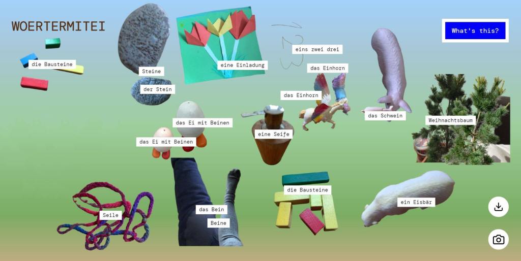 Eine mit https://strange.garden kollaborativ erstellte Fotocollage – hier Buchstabeneinführung Klasse 1: Wörter mit „ei“ (Seife, Einladung, Bausteine, Schwein, Eisbär, …)