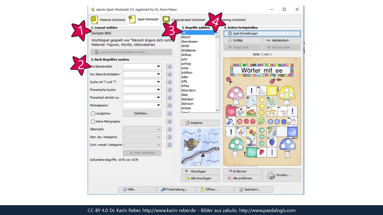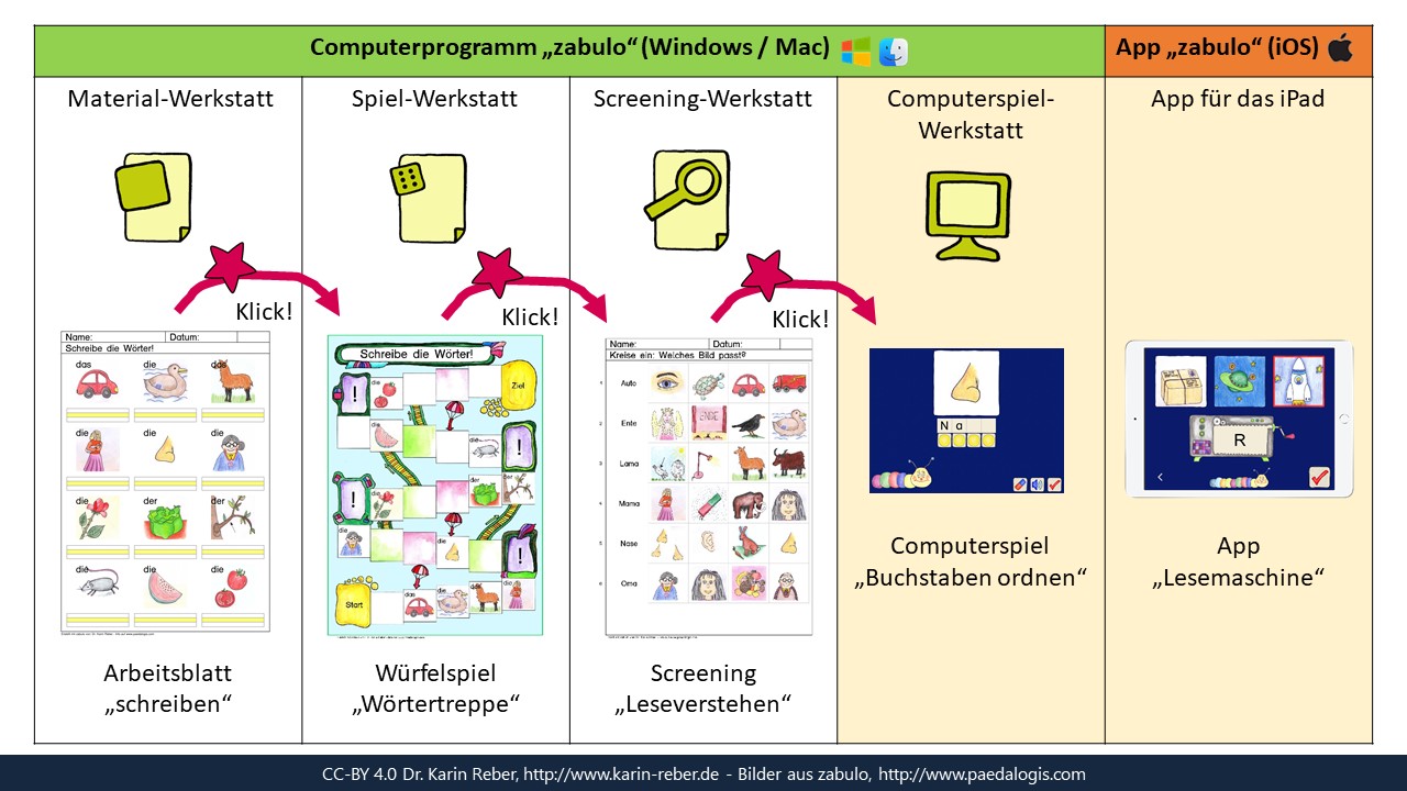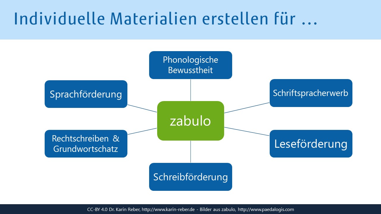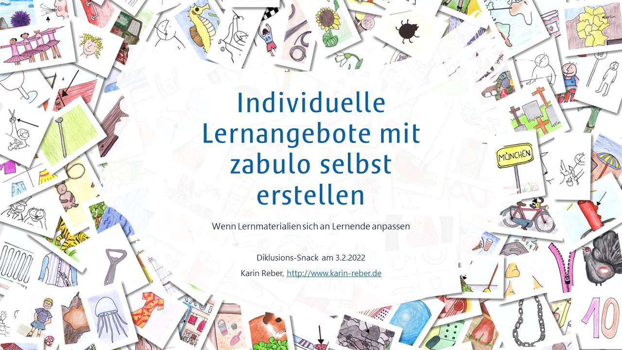 - Reber, K. (2021): Individuelle Lernangebote für Sprach- und Schriftsprachförderung mit ZABULO selbst erstellen. Wenn Lernmaterialien sich an Lernende anpassen. In: Schulz, L./Krstoski, I./Lüneberger, M./Wichmann, D. (Hrsg.): Diklusive Lernwelten. Visual Books, Dornstadt, 299-307. (erhältlich als kostenloses Open-Source-E-Book zum Download oder als Print-Buch, https://visual-books.com/diklusion)